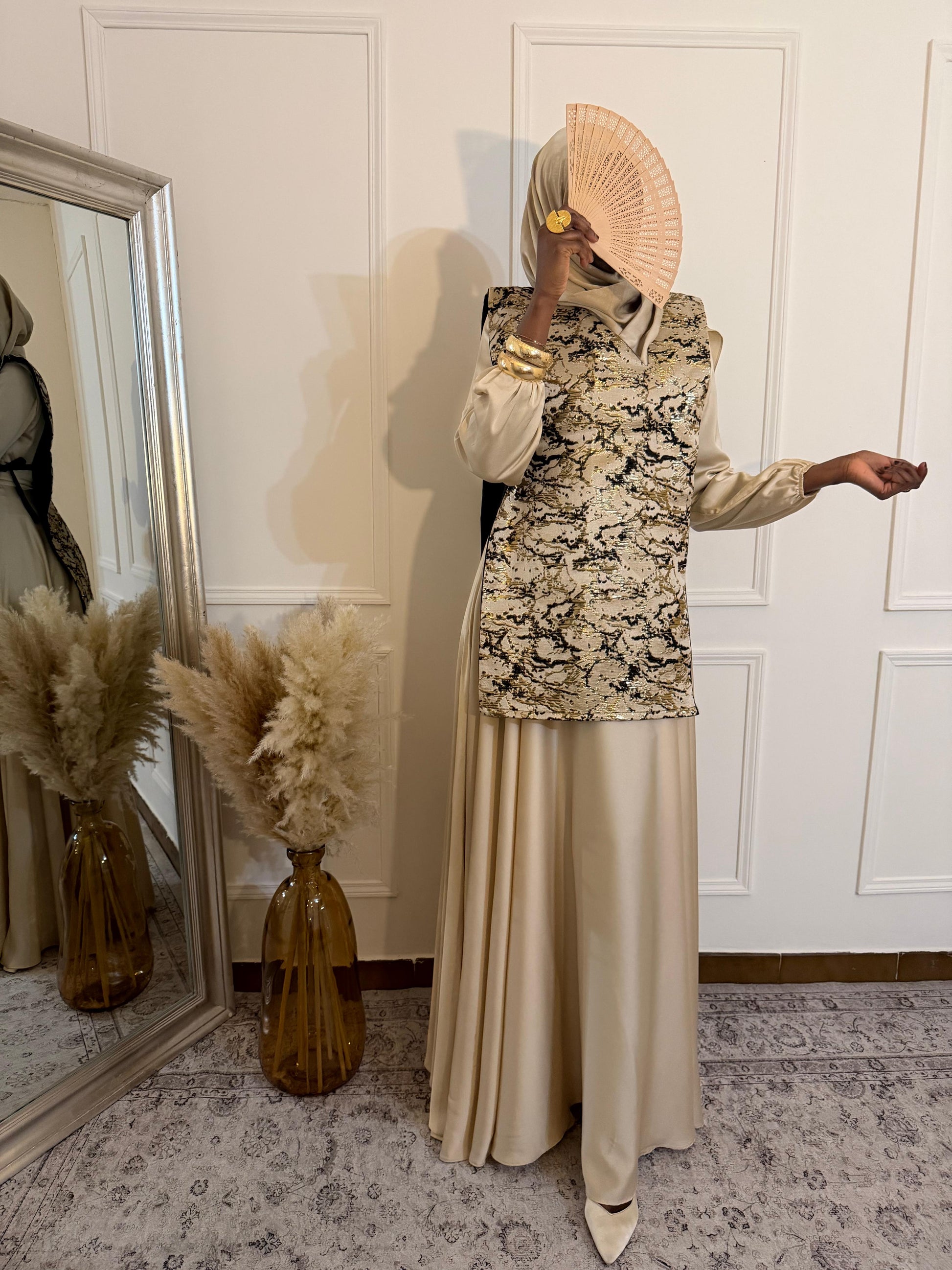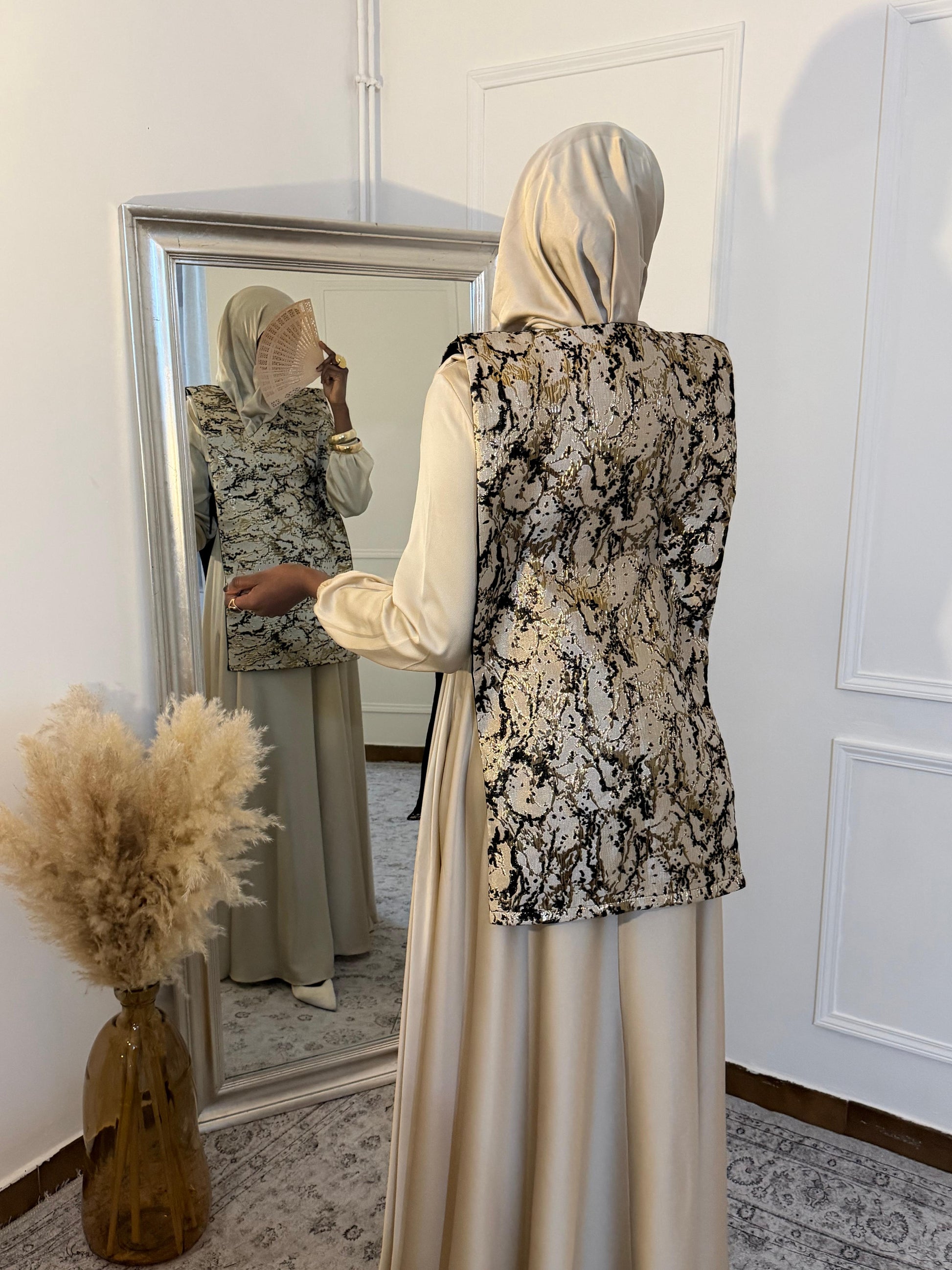 Cape élégante en brocart crème, noir et or, confectionnée artisanalement avec soin.