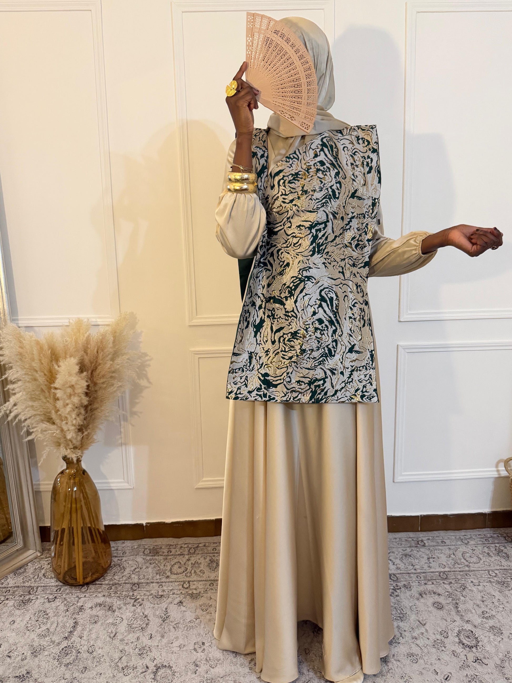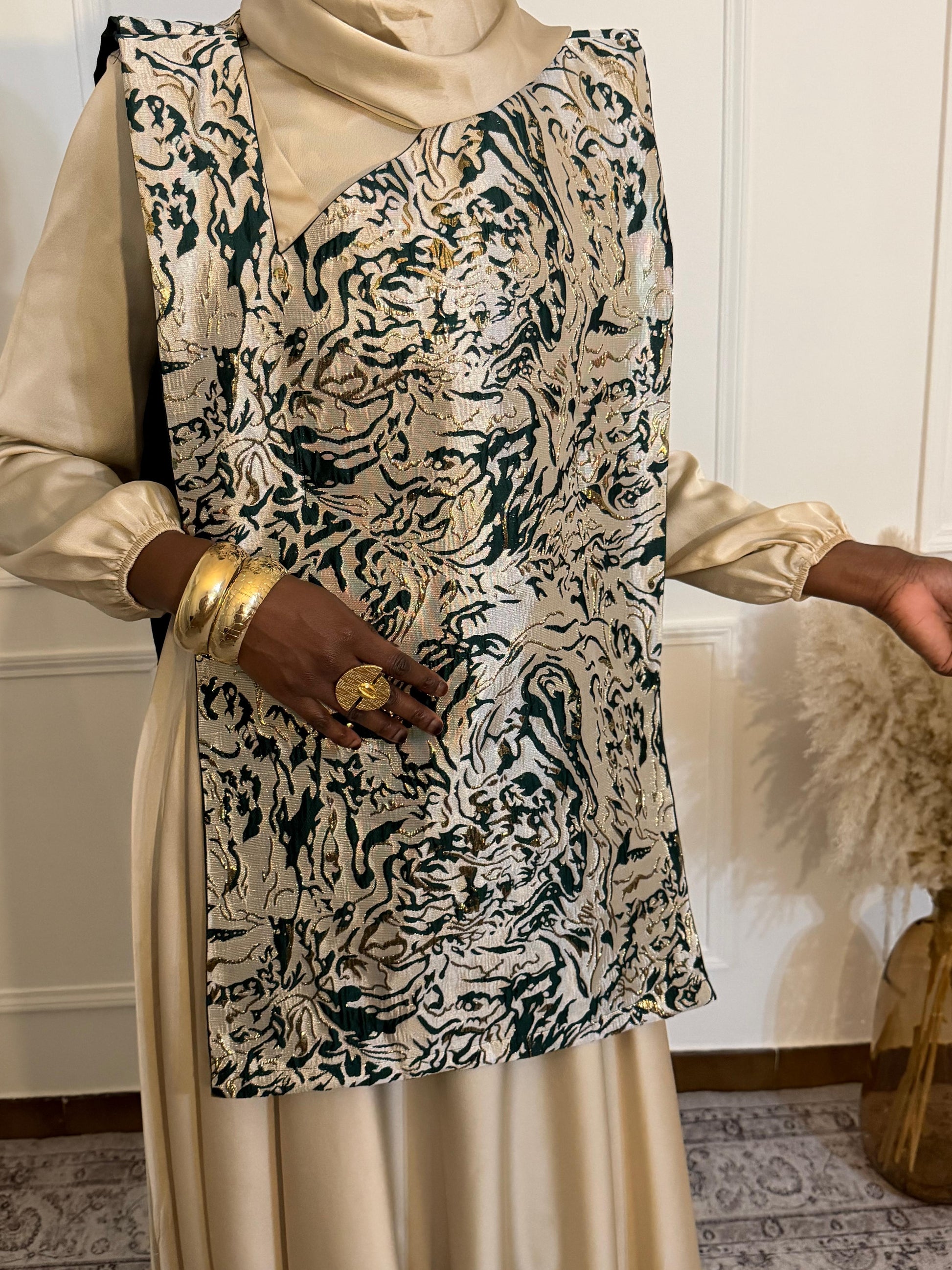 Cape élégante en brocart vert profond et or, confectionnée artisanalement avec soin.