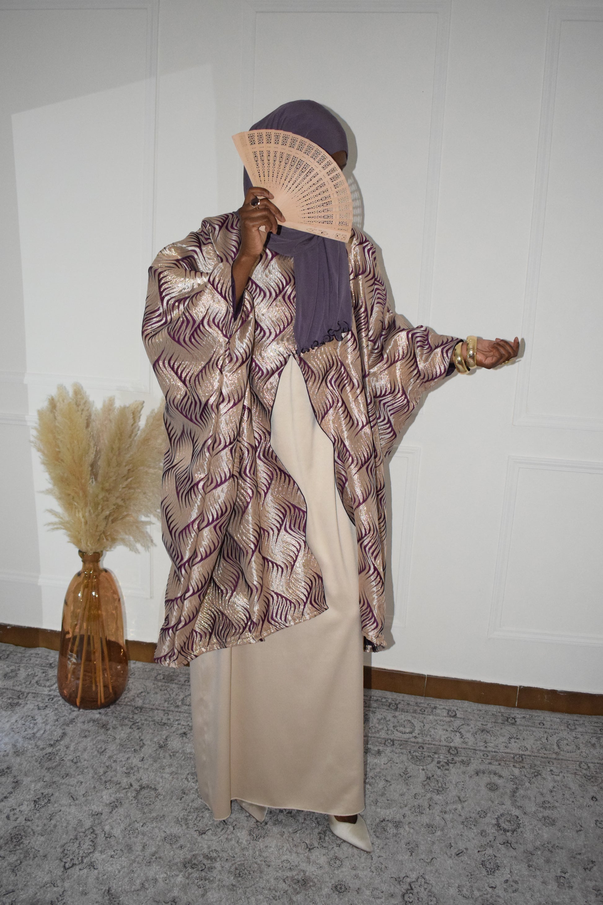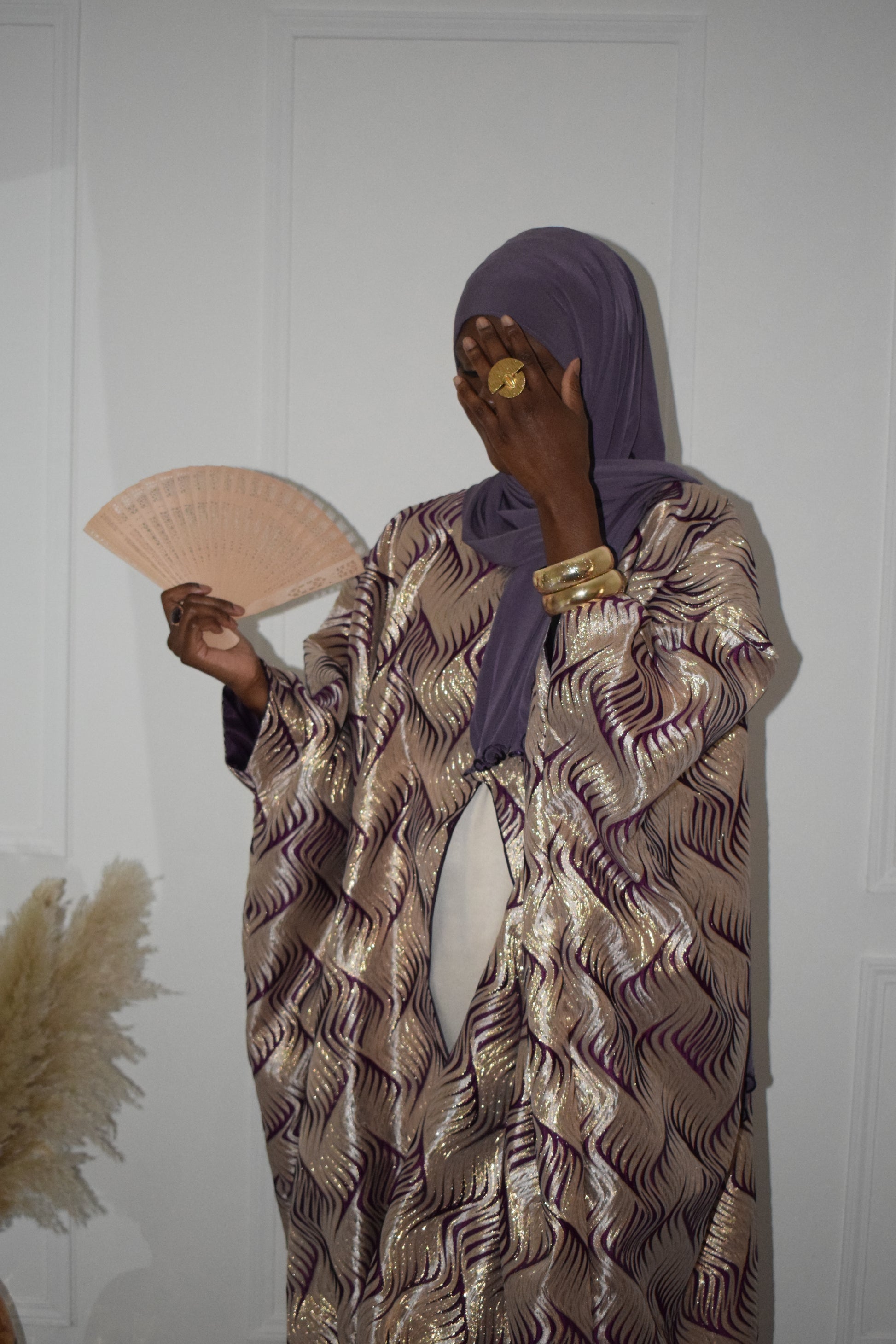 Ensemble composé d’un haut ample en brocart aux reflets dorés et d’une robe longue unie assortie, confectionnés artisanalement avec soin.